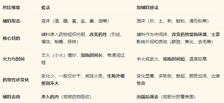 1.炙法核心: 液体辅料 + 文火慢炒 + 辅料渗入。这是与加辅料炒法最本质的区别。