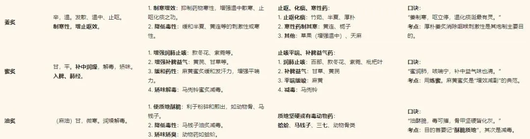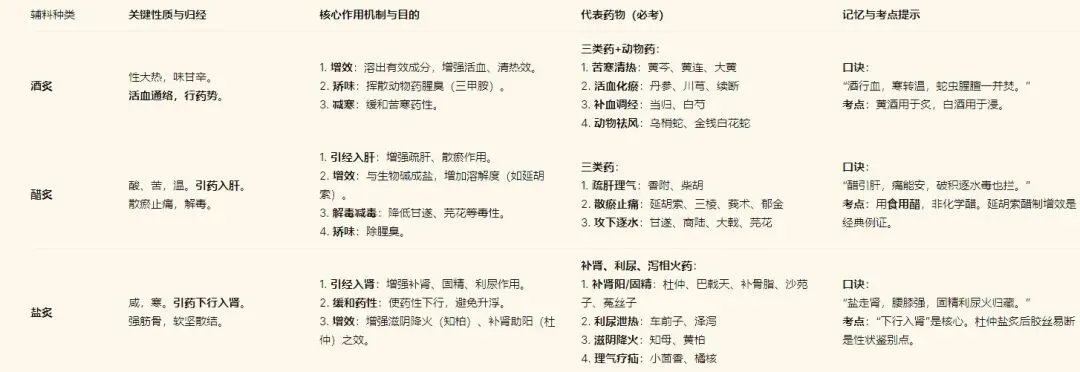 1.理解性记忆:不要死记。理解每种辅料的药性(如酒热、醋酸、盐寒)如何与药物相互作用,达到“以辅料之性,引或制药物之性”的目的。
