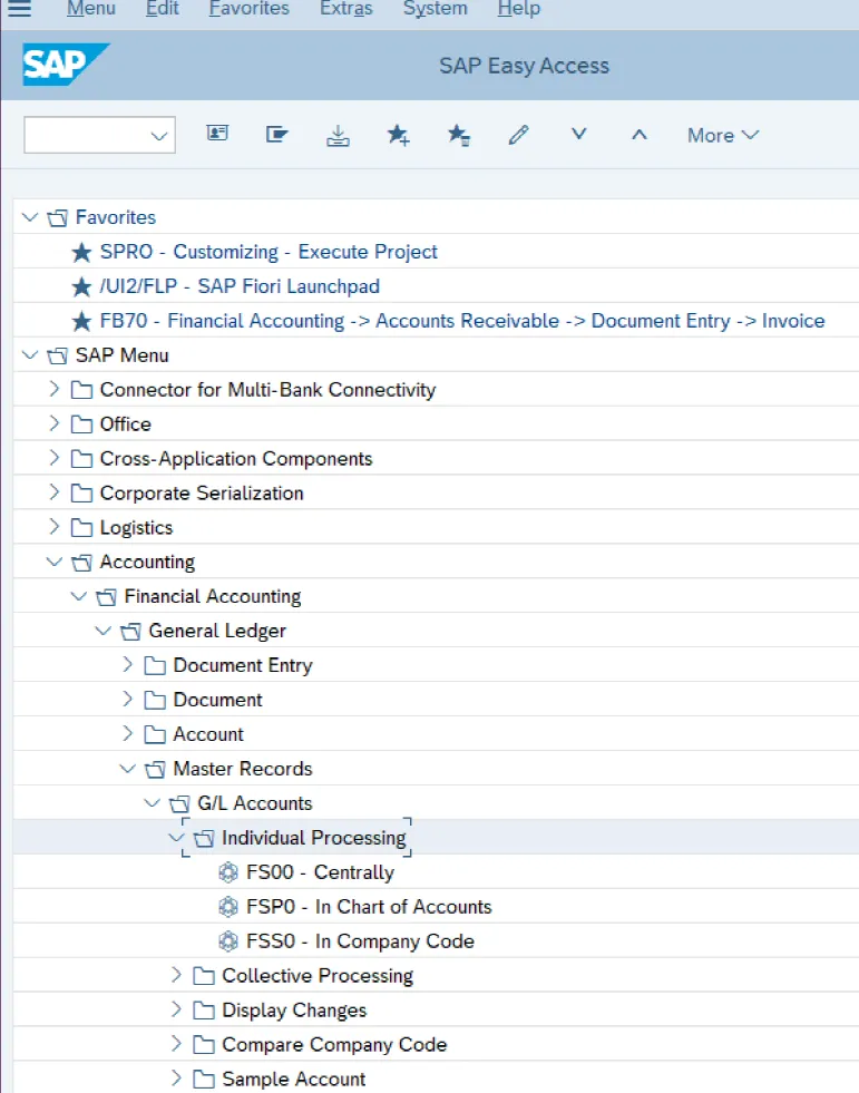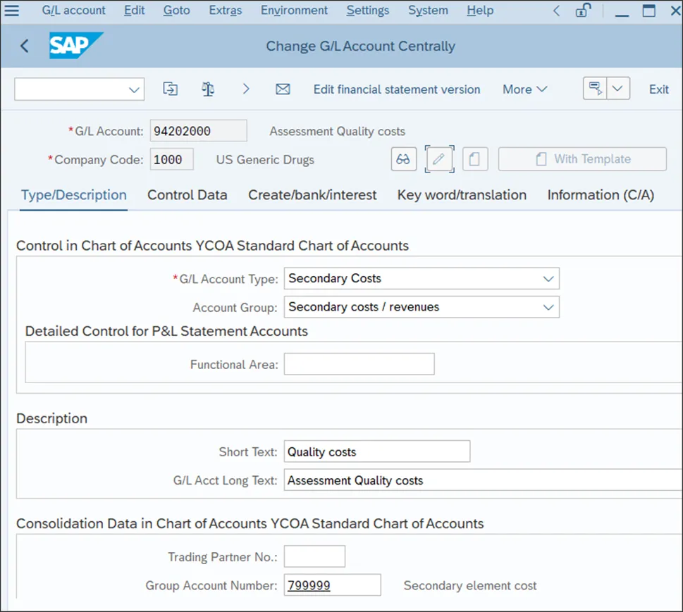 总账科目是主数据,可从 SAP S/4HANA 应用程序菜单进行维护。这些科目可以在每个客户端单独维护,但更常见且推荐的方法是在单个主数据客户端集中维护,并通过应用程序链接启用 (ALE) 将其分发到所有其他系统和客户端。总账科目在会计科目表级别和公司代码级别进行维护。在会计科目表级别,维护适用于使用此会计科目表的所有公司代码的设置,例如长描述和短描述以及组科目编号。然后,在公司代码级别,维护科目的大多数控制设置,例如货币、未清项目管理、行项目显示等。要维护总账科目,请按照应用程序菜单路径操作:会计 • 财务会计 • 总账 • 主记录 • 总账科目 • 单个处理。在这个屏幕上,您将看到有三个可用于维护总账科目的事务,如下图所示。输入事务 FS00 - 集中维护,这将使您能够访问会计科目表和公司代码设置。在下图所示的屏幕上,在“总账科目”字段中输入“94202000”,在“公司代码”字段中为您的新公司代码输入“1000”。然后,点击(更改)按钮,这将允许您更改总账科目的字段。这些字段按不同的选项卡进行组织。哪些字段是可选的、必填的或隐藏的,由科目的字段状态组控制。让我们来查看最常用的字段。在“类型/描述”选项卡下(该选项卡是在会计科目表级别维护的),有以下字段可用:总账科目类型(General ledger account type):确定科目的类型,例如资产负债表科目或损益表科目。- 功能范围(损益表科目类型):该字段与损益表科目相关,确定年终结算结果将转入的目标留存收益科目,以便您可以计算利润或亏损。