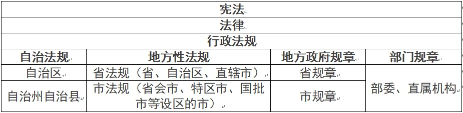 行政法在立法法中的地位:宪法、法律、法规(3种),规章(2种)