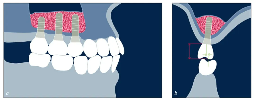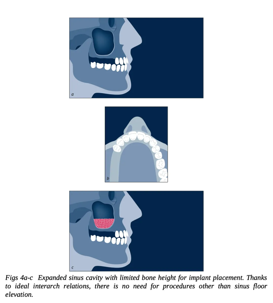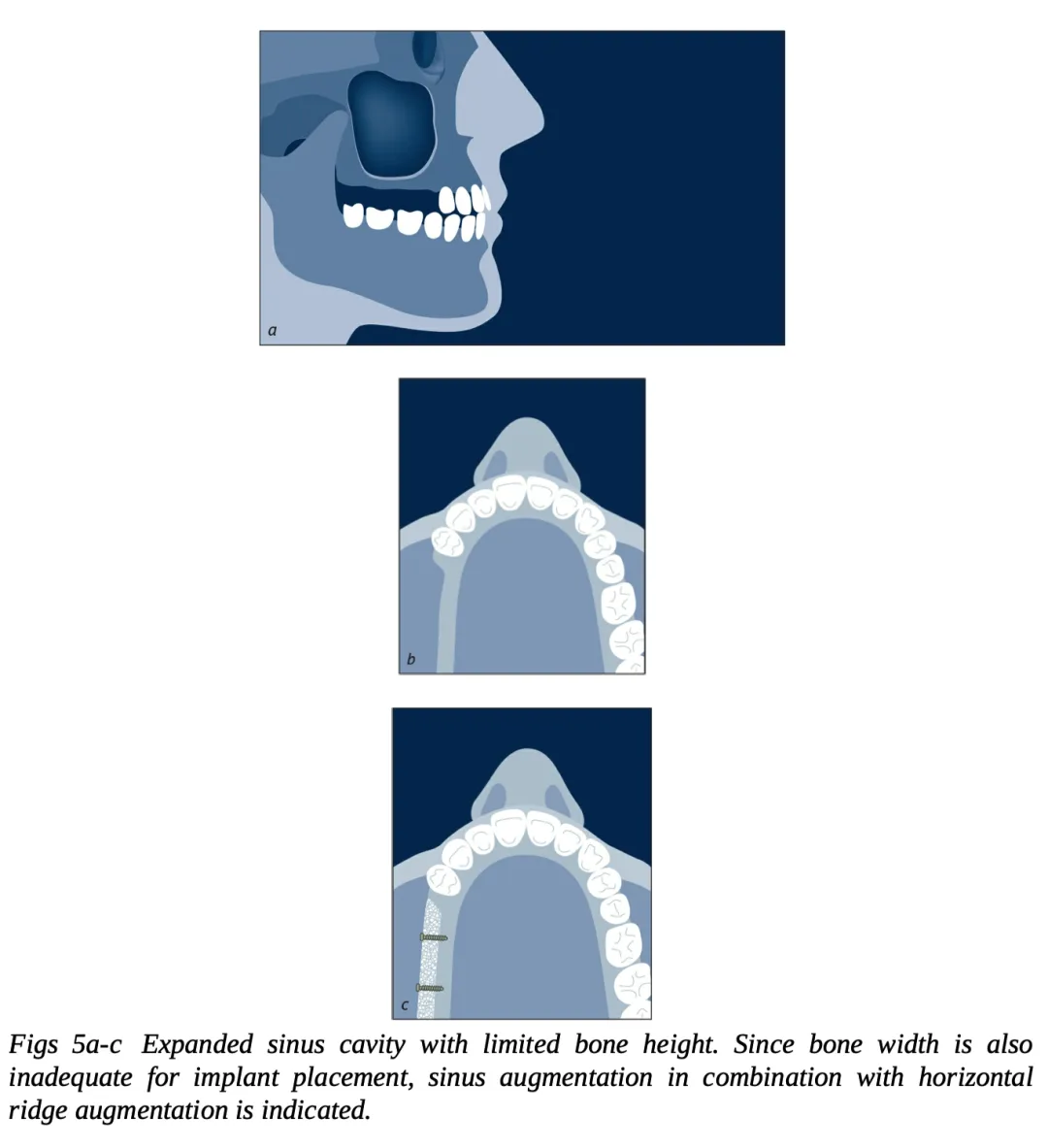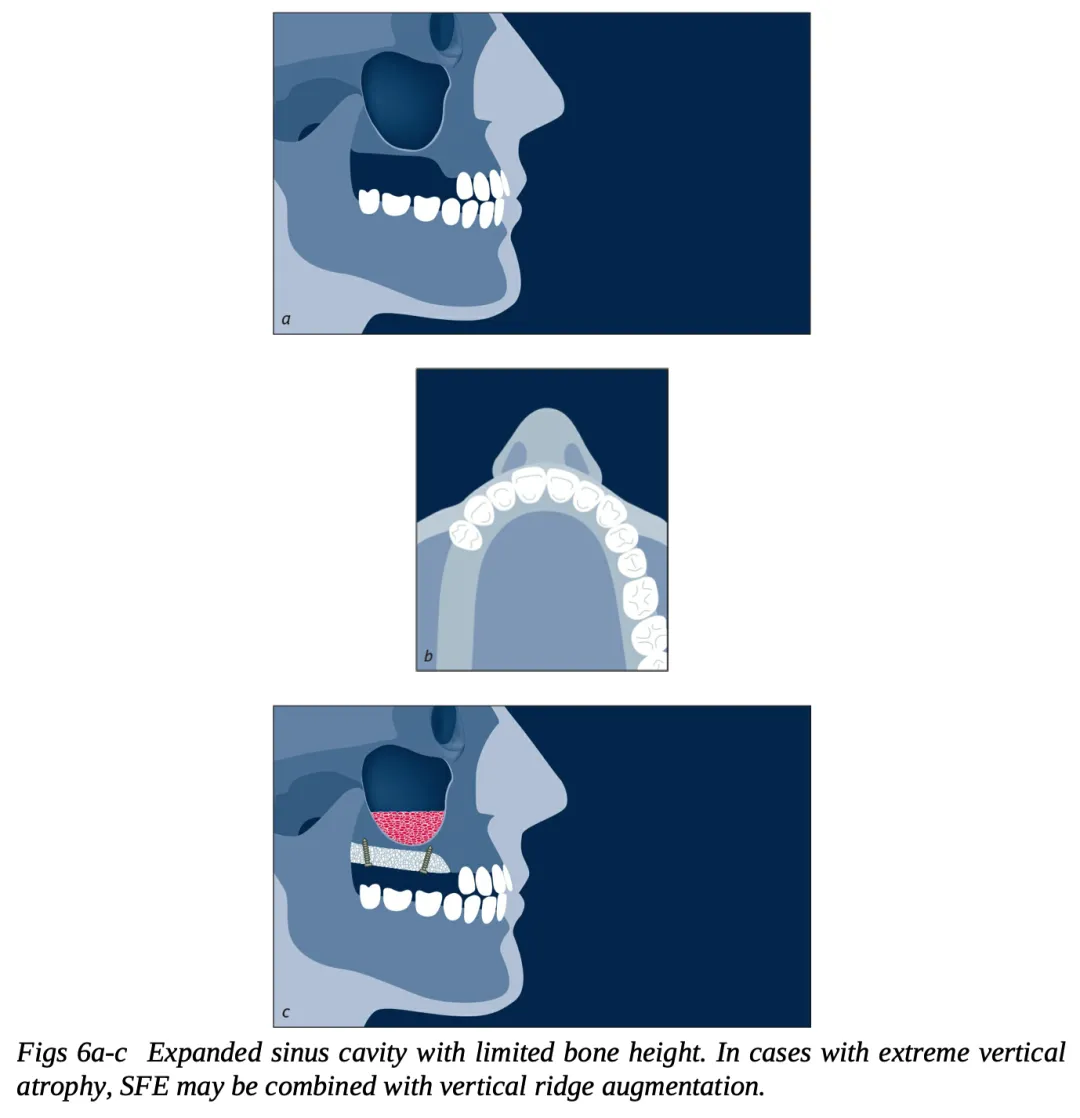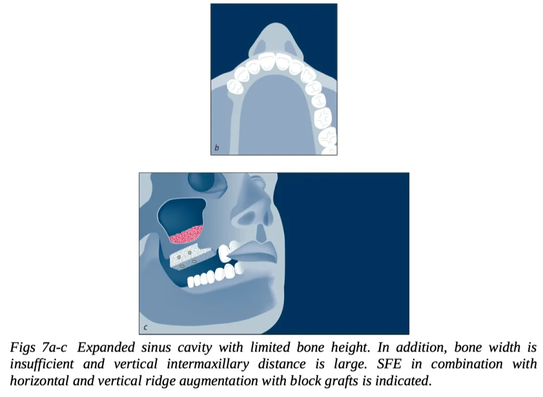 | 4 类(图 7a~c) | 窦底骨高度不足 | 上颌窦底提升和水平 / 垂直向牙槽嵴增量 块状自体骨(垂直向和水平向)移植(可以联合应用骨代用品和屏障膜) |