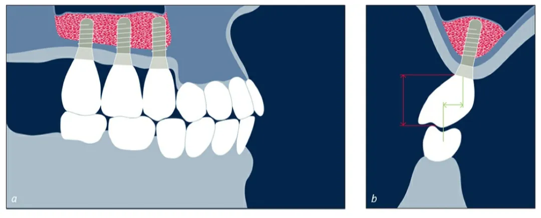 以 修复为导向(prosthetically driven) 的治疗方案确定种植体的位置和数目。本图示显示了上颌窦底提升的有利条件。因上颌窦扩张导致的上颌骨高度不足可以采用上颌窦底提升作为唯一的辅助性治疗程序这种条件不利于上颌窦底提升作为唯一的辅助性治疗程序。由于垂直向牙槽嵴吸收,需要延长种植体的牙冠。此外,水平向颌位关系不理想。如果这种垂直向和水平向的骨缺损过于严重,应当考虑进行三维位点改进的的联合方案必须制作包含正确颌位关系的 诊断蜡型(diagnostic wax-up):在研究模型上制作诊断蜡型,评估三维颌位关系。 如图 3b:诊断蜡型显示存在严重的垂直向骨吸收(红色蜡型位置),仅仅采用上颌窦底提升无法解决问题建议戴入放射性模板(radiographic template)进行 MCT 或 CBCT 扫描。建议对单颗牙种植体扩增的骨量要足以植入 长度 ≥ 10 mm 的种植体。1.2 分类和治疗方案 (Classification and Treatment Options)| 分类 | 临床特征 | 外科方案 |