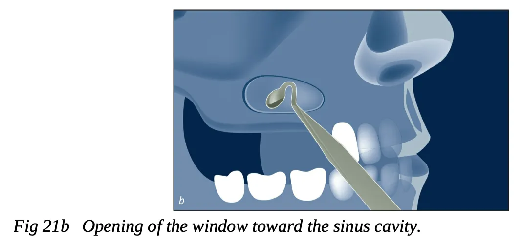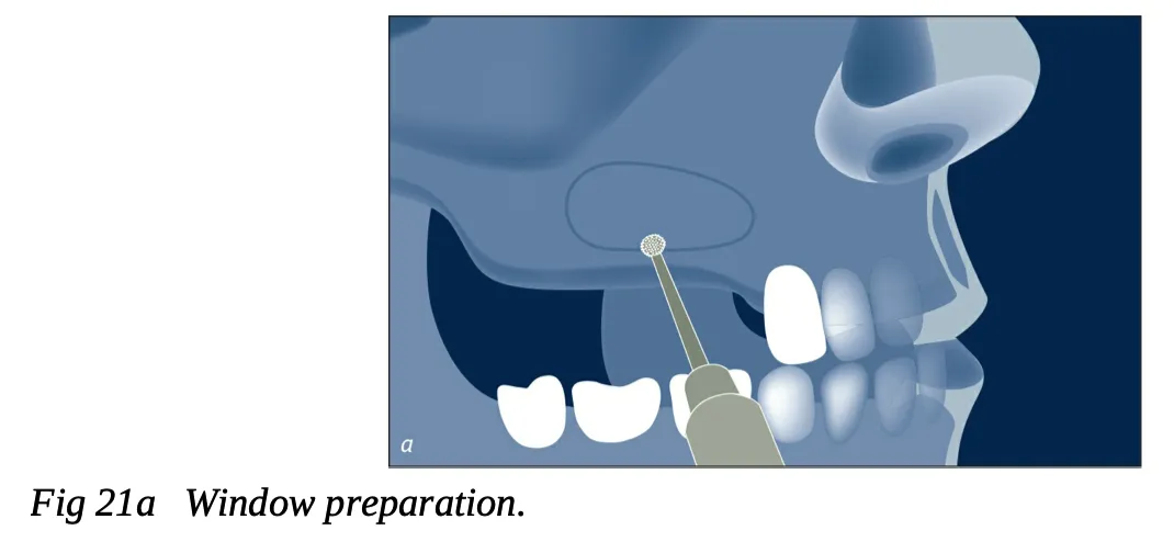 - 骨窗预备: 根据上颌窦的解剖形态确定开窗的大小和位置。 根据拟植入种植体的长度确定骨窗距离剩余牙槽嵴的高度,至少要在骨窗和种植体 根尖之间额外增加 2mm 的空间。