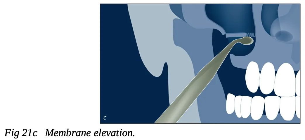 - 一旦上颌窦底折断,将自体骨和/或骨代用品输送到种植窝内、并用骨凿将其小心的挤入,通过挤压移植材料的压力提升上颌窦黏膜。