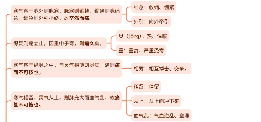 核心病因:寒邪为痛证主因,“寒气入经而稽迟,泣而不行”。