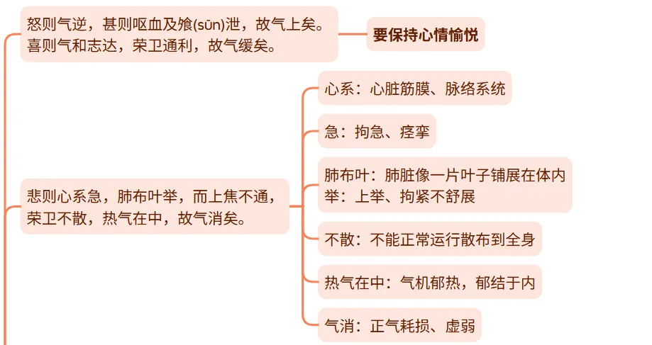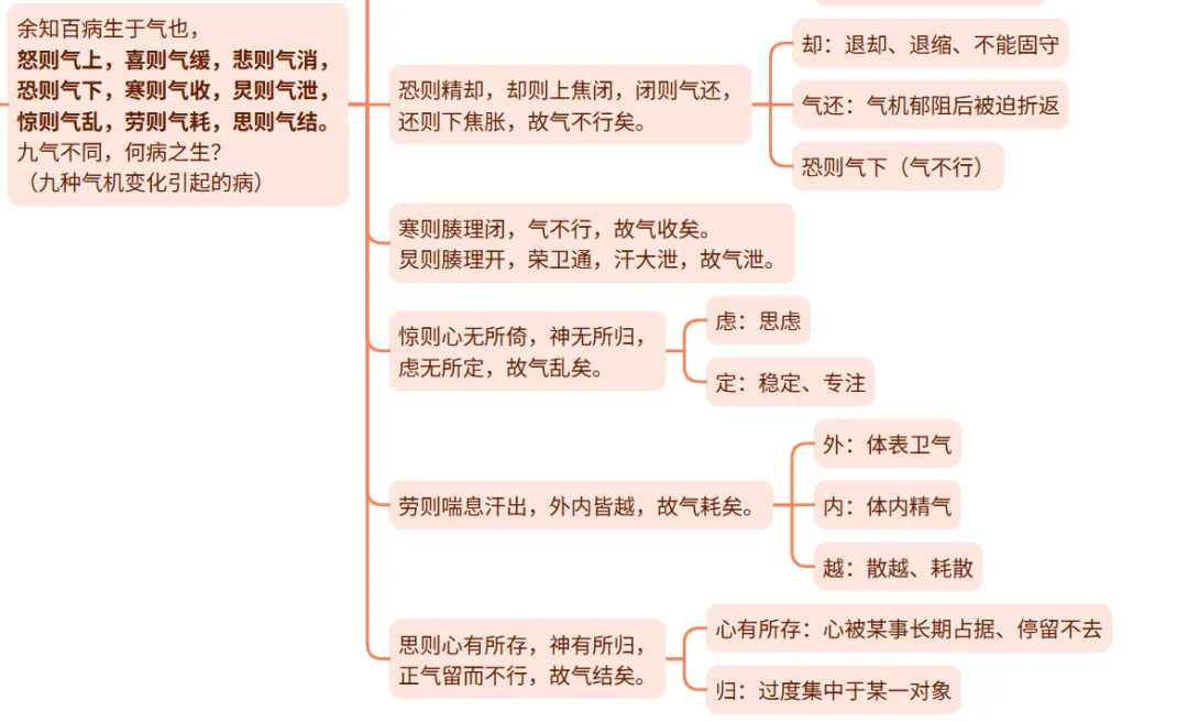 黄帝说:余知百病生于气也,怒则气上,喜则气缓,悲则气消,恐则气下,寒则气收,炅则气泄,惊则气乱,劳则气耗,思则气结。九气不同,何病之生? (九种气机变化引起的病)