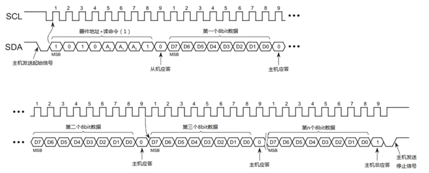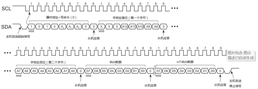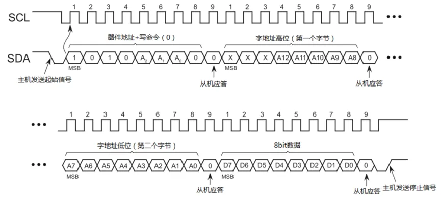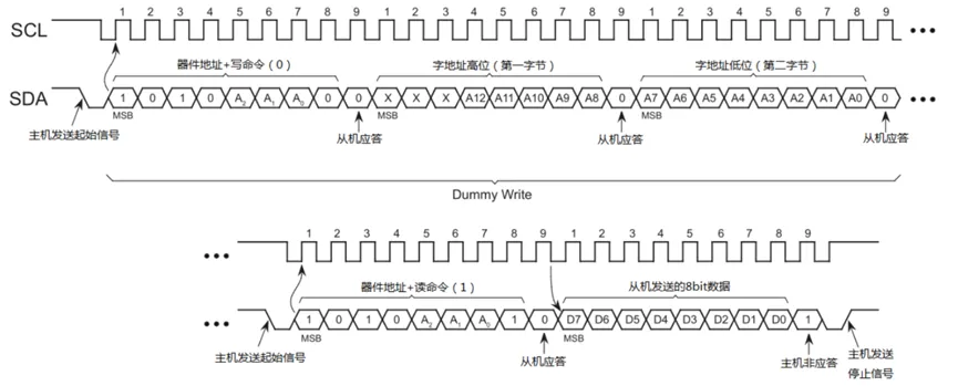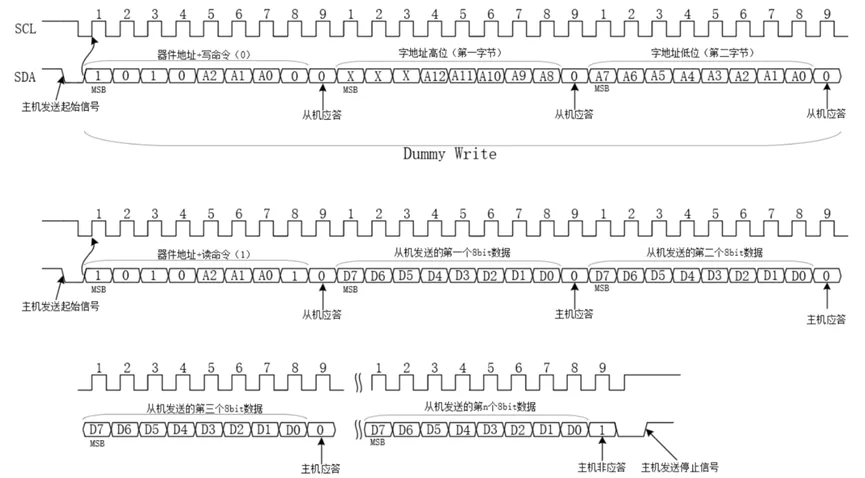 其中高4位是芯片固有的,不可更改,低3位(A2~A0)通常是芯片的管脚,可以通过上下拉设置不同的地址;I2C通讯时,除了需要器件地址外,还需要存储地址(通常是一个字节,有的E2PROM存储空间稍大,就是2个字节);在第9个SCK高电平之前,从机将SDA拉低,并在该时钟的高电平期间保持低;这就是从机发出的ACK信号,用于告诉主机自己接收正确;在第9个SCK高电平之前,主机将SDA拉低,并在该时钟的高电平期间保持低;这就是主机发出的ACK信号,用于告诉从机自己接收正确;时钟线SCL为高电平期间(High),数据线SDA由低电平向高电平变化(上升沿)表示终止信号;如果字地址是一个字节,则只需发送一个字地址;注意:写入的数据是一个字节;I2C器件在读写操作后,内部的地址指针自动加一;所以当前地址读是指在一次读或写操作后发起读操作。通过Dummy Write(虚写操作),使地址指针指向虚写操作中字地址的位置,然后再进行当前地址读;