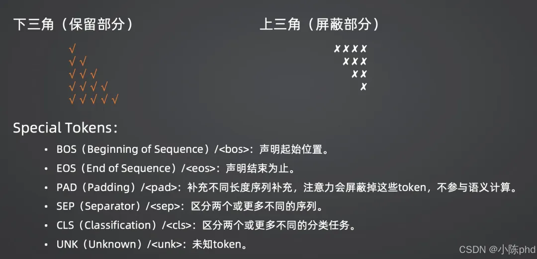 - • 作用:专门用于生成式模型(如GPT),强制模型在生成第 个Token时,只能看到第 到第 个Token,看不到第 及之后的Token。