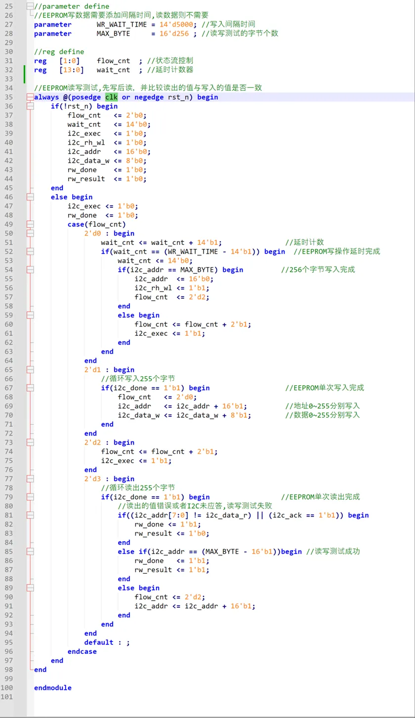 4)然后转入2'd3条件:等待i2c驱动模块给到i2c_done信号后,执行数值比较逻辑,如果读取错误或者应答失败,执行rw_done <= 1'b1;rw_result <= 1'b0;此时一直处于2'd3条件,但由于i2c驱动模块给到i2c_done信号不再有效,所以会一直处在2'd3条件,不再执行任何操作;如果读取正确,则将地址、数据都+1,又进入2'd2条件;如此往复执行256次后,即完成读取存储器地址0~255中的数据,然后执行rw_done<= 1'b1;rw_result <= 1'b1; 此时一直处于2'd3条件,但由于i2c驱动模块给到i2c_done信号不再有效,所以会一直处在2'd3条件,不再执行任何操作;