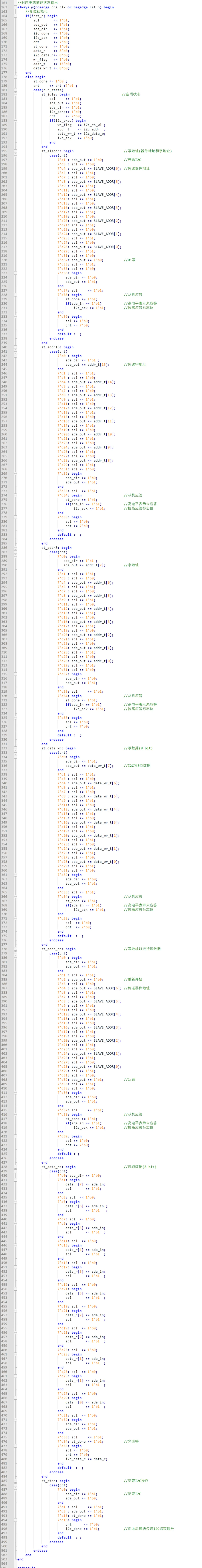 2)st_sladdr状态:通过计数器(cnt),依次送出器件地址(高位在前),同时给出应答信号(i2c_ack),进入st_addr16/st_addr8状态(由bit_ctrl控制);
