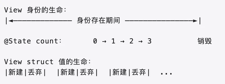 每次 body 求值都创建了新的 struct,但 @State 没有重置。因为 @State 绑定的是"身份",不是"值"。