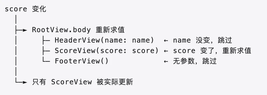 struct RootView: View {@State private var name ="Alice"@State private var score =0var body: some View { VStack { HeaderView(name: name) // 依赖 name ScoreView(score: score) // 依赖 score FooterView() // 无依赖 } }}