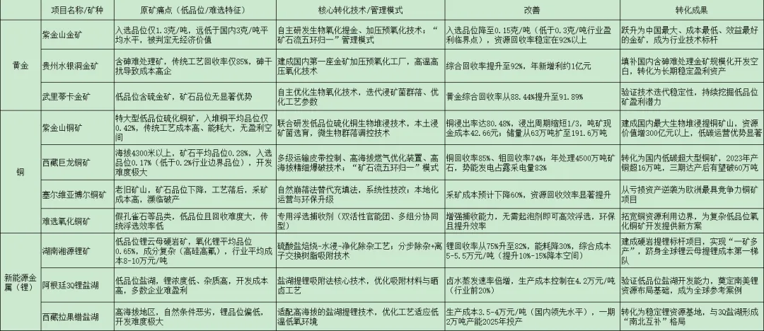 紫金矿业逆周期并购“抄底”策略:(1)行业周期底部判断(2)制定“铜金保现金流、锂矿谋增长、钼钾补储备”的三级策略(3)选矿策略:国外优选资源储量充足、成矿条件优越的标的,以低价(<行业均值30%-50%)并购,通过技术注入并依托当地低成本能源与人力降低运营成本,将低估值资产转化为高盈利资产。国内项目则聚焦可以技术突破盘活边际资源的标的,完善矿种梯队。