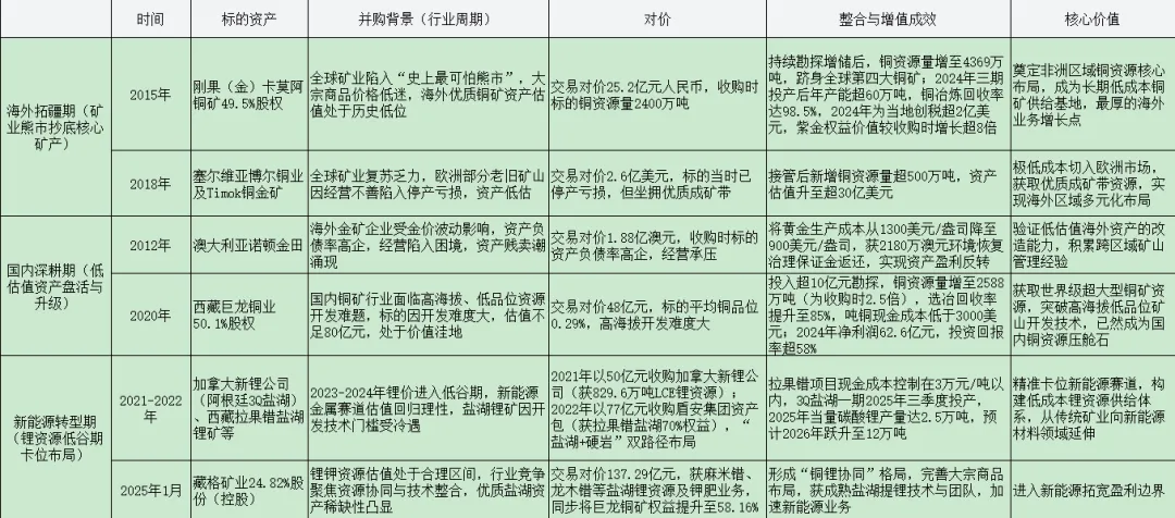上述成本控制如果是芝麻,资源获取环节的成本锁定就是西瓜。紫金矿业精准的逆周期并购策略,在行业低谷期布局优质资产,以低于行业均值的成本扩大资源储备,为长期成本优势保底。