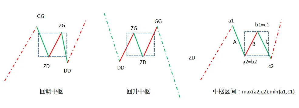 2、本节中的中枢定义,缠师给出了最明确的数学表达,如果转化为形态上的表达,如下图: