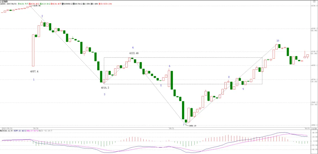 注:关于这两个中枢重叠后构成高一级别的中枢,可以这么理解,两个中枢一共6段,加上中间的连接段是7段,再加上第一个中枢的进入段和最后一个中枢的离开段,一共是九段,九段后中枢级别就升级。那么对高一级别的中枢怎么分析呢?这个具体要针对不同的形态来具体分析,我举两个原文实例看看: