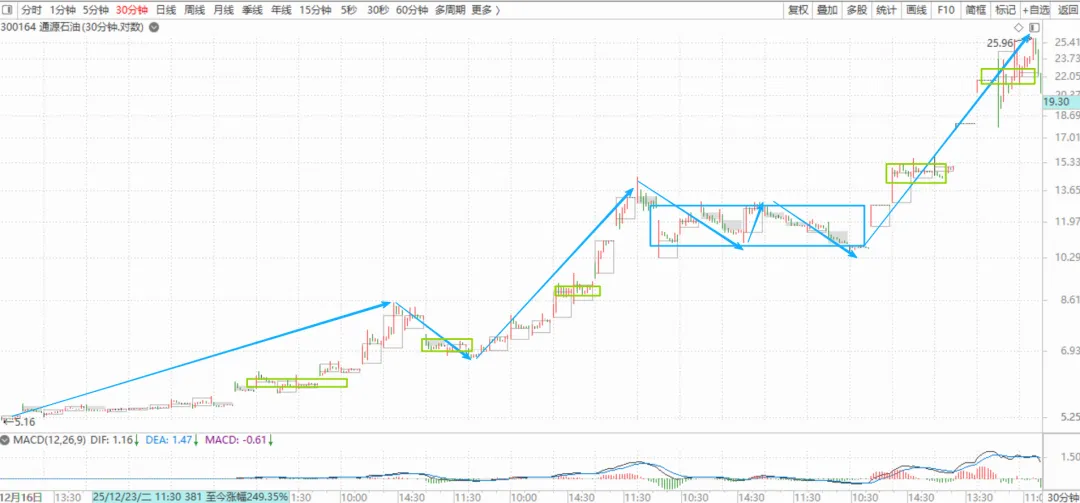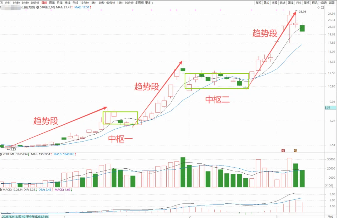4、走势中枢定理一非常重要,它说明了在趋势中,连接同级别中枢的,必然是次级别以下的级别的走势类型,什么意思呢?趋势,一定是有两个中枢的走势,那么这两个中枢一定有连接段,那么这个连接段的级别一定比形成这个中枢的级别小,小到多少呢?最小的可以为缺口,我先选个强势的个股观照下: