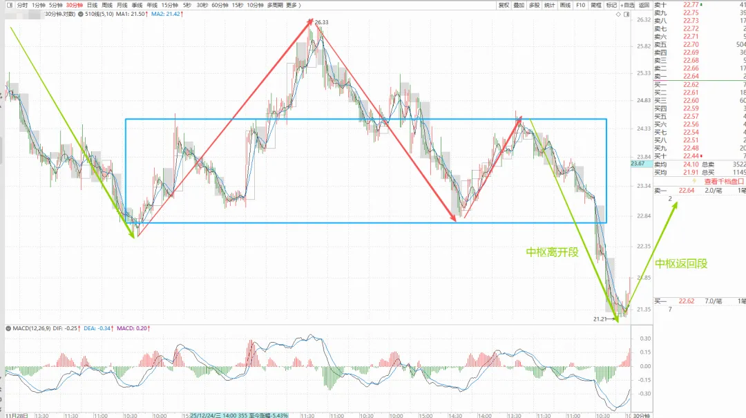 中枢定理一说的就是上图中的绿色中枢的级别比蓝色中枢的级别小。这是针对趋势来说的,那么盘整呢?就是定理二说的内容,看图: 相对于中间这个中枢,绿色的离开段和返回段,这两段的级别一定比形成红色中枢的级别小,小到多少呢?可以是最低级别的缺口。