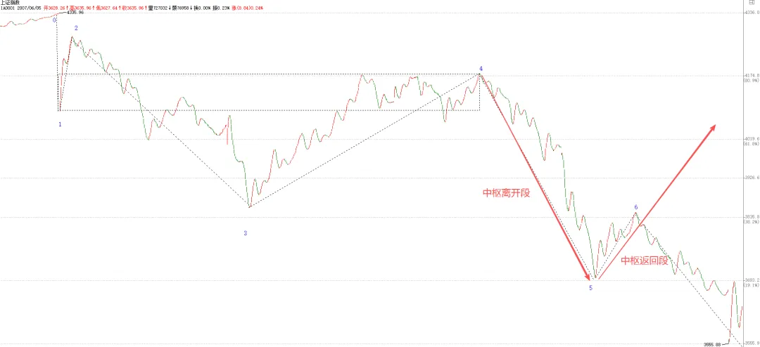 缠师对这个定理的解释中列举了一个例子,但是没有图形,因为说是一分钟图,我就用后期缠师用的大盘分析图来说明。 上图中枢是1-4,那么4-5是中枢离开段,5-6是返回段,这两个级别都是比一分钟小的级别,利用57课说法就是,站在最小分析级别的角度,每一线段就是其次级别走势类型,三个线段重合就构成最小分析级别的中枢,本图就是在最小分析级别上观照,只研究线段,没有笔的概念,可以忽略图中线段以下所有的走势。也就是这两段的级别一定比盘整的级别小,走势走到7这个位置,仅仅是只有一个中枢的盘整走势类型,如果5-6回到了中枢里去,那么就属于中枢延伸了。这里为什么说到7时,这仅仅是一个盘整呢?因为6的第三来卖点决定了这段走势的结束。由这缠师又能引出中枢定理三,这个定理三就是后期第三类买卖点的由来。