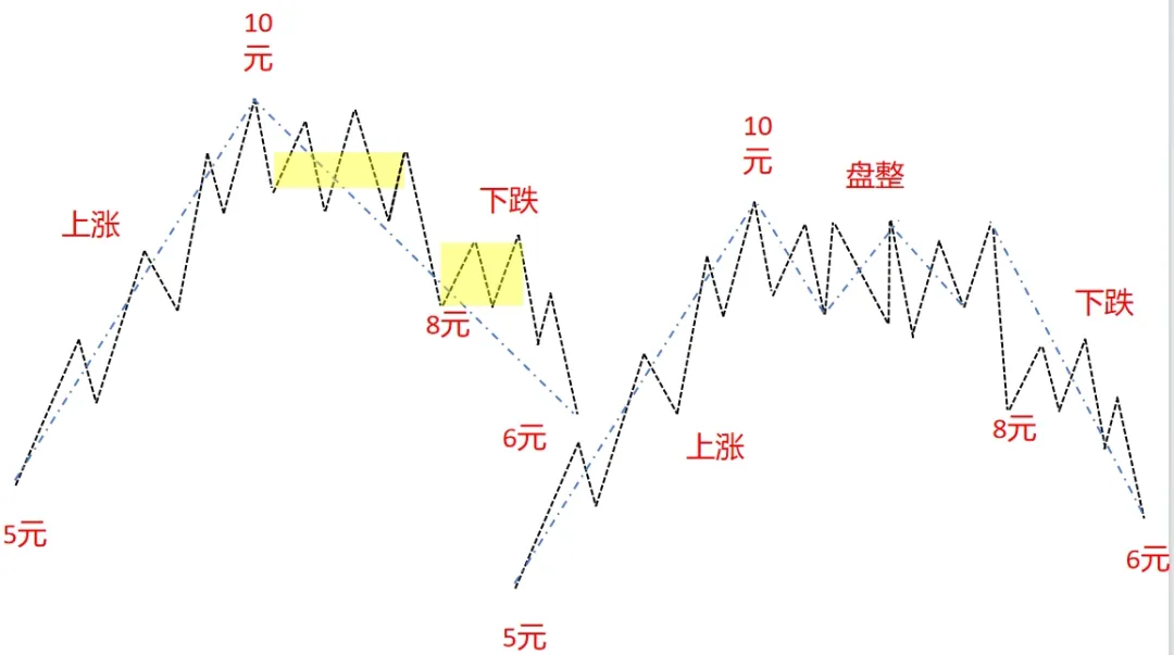 1、因没图,用假设的例子举例:有一段是上涨趋势从5元涨到10元,而后在10元附近形成了一个中枢,而后下跌至8元附近形成一个中枢,后再下跌至6元后趋势改变,请问10元至6元算不算是一次在高一级别的下跌趋势,不知我说明白没有,意思就是刚好在顶部有一个中枢的,其后下跌中又形成一次中枢,因高点处中枢是转折点,既对前边的上涨有关,也与其后的下跌有关,请指教。