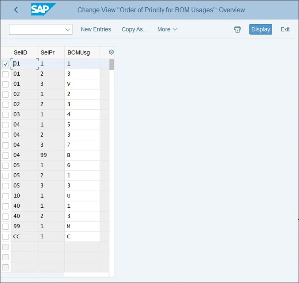 在 SAP S/4HANA 中,由于简化采购实现的逻辑,MRP 将根据生产版本选择 BOM。但是,如果存在不同的生产版本,并且每个版本引用具有不同用途的物料清单,则物料需求计划将根据物料清单选择 ID 字段中定义的优先级选择生产版本。
