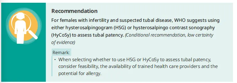 对于有不孕症且疑似患有输卵管疾病的女性,WHO建议使用子宫输卵管造影(HSG)或子宫输卵管对比超声造影(HyCoSy)来评估输卵管通畅性。(有条件推荐,证据确定性低)•在选择使用HSG还是HyCoSy来评估输卵管通畅性时,应考虑可行性、受过培训的医疗服务提供者的可用性以及过敏的可能性。背景与论证