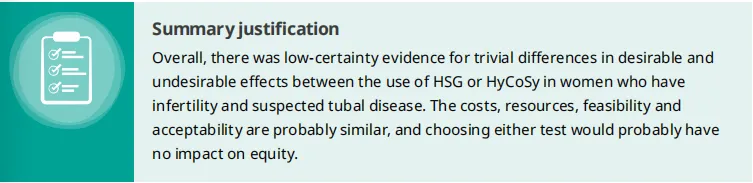 对于有不孕症且疑似患有输卵管疾病的女性,是否应使用HyCoSy与HSG进行评估?总体而言,对于有不孕症且疑似患有输卵管疾病的女性,使用HSG或HyCoSy的期望和非期望效应差异微乎其微,证据确定性低。成本、资源、可行性和可接受性可能相似,选择任一种检测可能对公平性无影响。实施考虑因素