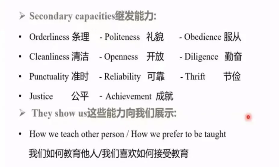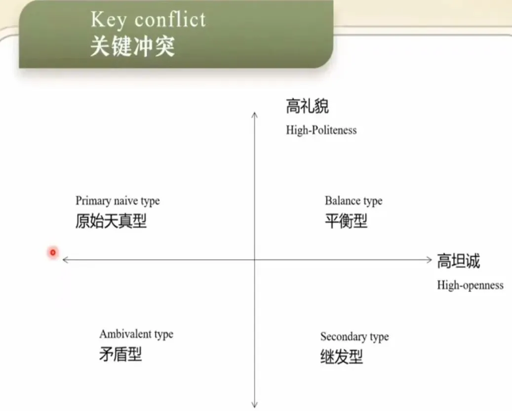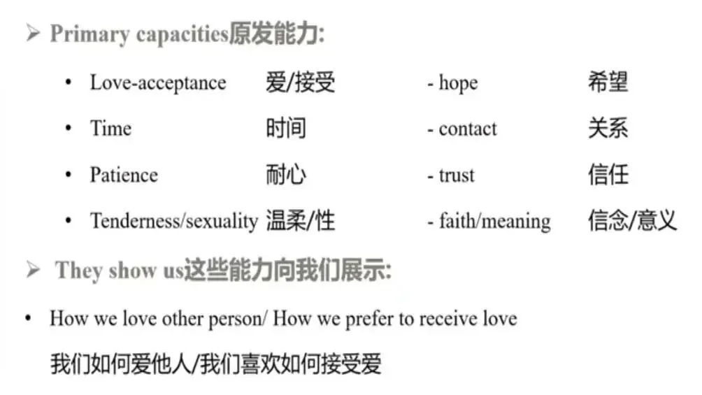 两个基本能力:爱——感性,原发能力;认知——理性,继发能力继发能力:3-7岁间,与成长时的重要人物和社会文化环境有关症状——希望在现实落空,出现潜意识冲突的适应性表达; ——原本受“自我”及其“防御机制”管制的部分在现实冲突里释放基本冲突:是原发能力和继发能力的冲突,比如,小时候爱整洁能换来妈妈的爱,长大后发现在别人那里,爱整洁也换不来爱。完成作业才能去玩,也是基本冲突。矛盾型:不稳定,难以预测。有时像原始天真型,总是照顾别人的需求,但一段时间后,自己受不了了,就变成只顾自己需要。我的重要收获:知道有一类家庭是成就导向型,比如我自己的家,如果孩子不优秀、不成才,就会被嫌弃、不被爱;或者如果做事不按父亲的期待,也会被推开。这类人在未来发展中失衡时,会很纠结,因为不放下会让自己处境很艰难,但放下的话,她自己也会不爱自己。