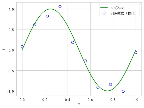 可以使用numpy和matplotlib实现样本数据的生成和曲线绘制,其中np.random.normal为随机高斯分布方法,scale参数为标准差。from matplotlib import pyplot as pltimport seaborn as snssns.set_style("whitegrid")plt.rcParams["font.family"] = ["SimHei"] # 多字体备选plt.rcParams["axes.unicode_minus"] = False # 解决负号问题生成理想曲线的数据样本x = np.linspace(0, 1, 100)y = np.sin(2 np.pi x)生成加入指定标准差的高斯噪声的模拟训练样本x_train = np.linspace(0, 1, 10)np.random.normal(loc=0, scale=1, size=x_train.shape) loc为均值,scale为标准差y_train = np.sin(2 np.pi x_train) + np.random.normal(scale=0.25, size=x_train.shape) 绘制理想曲线plt.plot(x, y, color='g', label="\sin(2\pi x)")绘制训练数据样本散点图plt.scatter(x_train, y_train, s=50, edgecolors='b', facecolors='none', label="训练数据(模拟)")plt.xlabel("x")plt.ylabel("t")plt.legend()