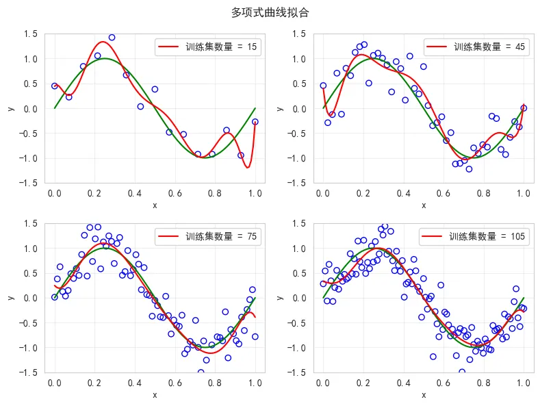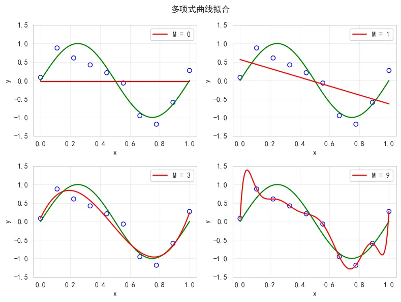 可以使用多项式函数来拟合这个曲线,其中M是多项式的阶数,M=0函数曲线就是一个水平直线、M=1函数曲线是一个斜率为w1的直线、M=2函数曲线是一个抛物线,这些都是我们熟知的函数曲线,显然要模拟近似正弦曲线至少需要阶数M>=3,这个阶数属于超参数需要事先指定好。显然我们的目标就是求出多项式的系数w,因为我们已经知道理想曲线是什么,当然也就知道目标值(有参考目标的学习过程称为监督学习),一种自然的思路是根据已知(x,y)的模拟数据求解平方和误差函数最小情况下的w值,这就是最小二乘法,求解这个方式涉及求偏导,这里不做展开,求解多项式系数w的过程就是在进行模型训练。scikit-learn已经封装了多项式求解的方法,以下代码分别实现了多项式阶数为0、1、3、9四种情况下的曲线拟合效果。from sklearn.preprocessing import PolynomialFeaturesfrom sklearn.linear_model import LinearRegressionsklearn要求输入的特征矩阵为二维(样本数,特征数)xtrain = x_train.reshape(-1, 1)y_train = y_train.reshape(-1, 1)fig = plt.figure(figsize=(8, 6))fig.suptitle("多项式曲线拟合")for i, degree in enumerate([0, 1, 3, 9]):# 2 行 2 列plt.subplot(2, 2, i + 1)# PolynomialFeatures负责实现多项式函数:相当于把输入x转换为各次方的值,如x^0、x^1、...poly = PolynomialFeatures(degree=degree)x_train_poly = poly.fit_transform(x_train.reshape(-1, 1))# 利用线性模型训练,其实就是根据最小二乘求解多项式系统wmodel = LinearRegression()model.fit(x_train_poly, y_train)# 打印多项式系数features_name = [f"w{i}" for i in range(model.coef.size)]print(f"\n多项式阶数 M = {degree}")for w, v in zip(featuresname, model.coef[0]):print(f"{w if w!="1" else "w0"} = {v}")# 预测结果x_test = np.linspace(0, 1, 100).reshape(-1, 1)x_test_poly = poly.transform(x_test)y_predict = model.predict(x_test_poly)# 绘制理想曲线plt.plot(x, y, color='g')# 绘制训练数据散点图plt.scatter(x_train, y_train, facecolor='none', edgecolor="b")# 绘制预测值曲线plt.plot(x_test, y_predict, color='r', label=f"M = {degree}")plt.ylim(-1.5, 1.5)plt.xlabel("x")plt.ylabel("y")plt.legend()plt.grid(alpha=0.3)plt.tight_layout()plt.show()