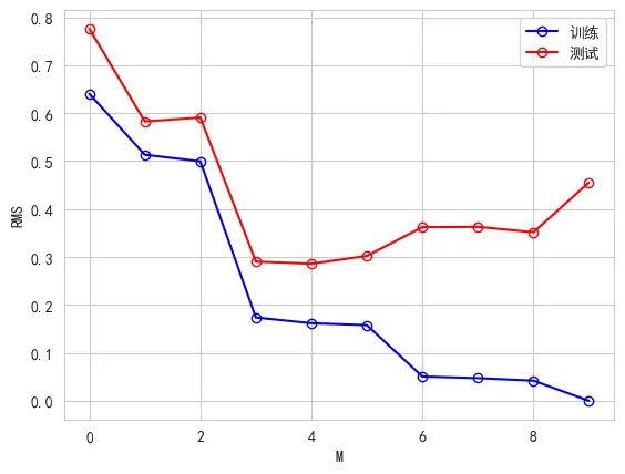 均方根误差曲线RMS定义如下,它类似上面平方和误差的均值我们可以绘制不同阶数下的RMS曲线来直观感受训练误差和预测误差的变化情况,阶数越高训练误差越小,但是由于出现过拟合的问题导致泛化能力变差,测试误差在阶数大于4之后出现了变大的情况。不同阶数M对应的均方根误差曲线RMSdef rms(y_i, y_r):return np.sqrt(np.mean(np.square(y_i - y_r)))x_test = np.linspace(0, 1, 100).reshape(-1, 1)测试数据的目标值np.random.seed(42)y_test = np.sin(2np.pix_test) + np.random.normal(scale=0.25, size=x_test.shape)不同阶数M的模型训练与预测rms_train = []rms_pred = []M_list = list(range(0, 10))for M in M_list:poly = PolynomialFeatures(degree=M)model = LinearRegression()# 训练模型,就是多项式系统wmodel.fit(poly.fit_transform(x_train.reshape(-1, 1)), y_train)# 求测试集均方根误差y_pred = model.predict(poly.fit_transform(x_test))rms_pred.append(rms(y_test, y_pred))# 求训练集均方根误差y_pred_train = model.predict(poly.fit_transform(x_train))rms_train.append(rms(y_train, y_pred_train))训练集误差曲线plt.plot(M_list, rms_train, 'o-', color="b", ms=6, mfc="none", label="训练")测试集误差曲线plt.plot(M_list, rms_pred, 'o-', color="r", ms=6, mfc="none", label="测试")plt.legend()plt.xlabel('M')plt.ylabel('RMS')