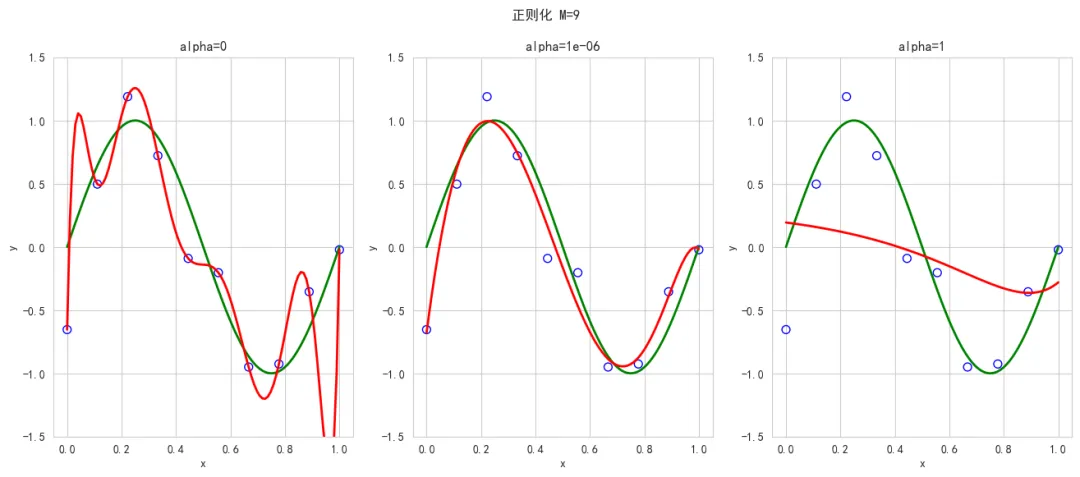 根据前面的结果可以发现M=9的拟合曲线对应的多项式系数w波动特别大,这是出现过拟合的一个典型特征,抑制过拟合问题就可以通过抑制多项式的系统w的波动来实现,有两个方法可以达到这个效果。一个是增加训练数据的样本数,下图是测试了训练数据不断增加情况下M=9曲线拟合的变化(可以参考前面曲线拟合的代码自行修改验证),显然随着训练数据的不断增加拟合的效果也越来越好。但是现实中,增加训练数据往往并不容易做到,存在客观现实的制约。另一种方式在平方和误差函数中加入惩罚项以抑制系数w的大幅变化,这种技术称为正则化。其中λ用来控制惩罚项的影响效果,如下代码基于正则化实现了不同系统下对M=9曲线过拟合的抑制效果,alpha类似于系数λ,显然值越大对过拟合的抑制效果越明显,但显然并不是越大结果越好。from sklearn.linear_model import Ridgex_train = np.linspace(0, 1, 10).reshape(-1, 1)y_train = np.sin(x_train 2 np.pi) + np.random.normal(scale=0.3, size=x_train.shape)x = np.linspace(0, 1, 100).reshape(-1, 1)y = np.sin(x 2 np.pi)fig = plt.figure(figsize=(16, 6))fig.suptitle("正则化 M=9")正则化项系统alphas = [0, 1e-6, 1] # 1e-6 = 1 * 10^(-6)for i, alpha in enumerate(alphas):plt.subplot(1, 3, i + 1)plt.title("alpha={}".format(alpha))plt.scatter(x_train, y_train, s=50, edgecolors='b', facecolors='none')plt.plot(x, y, 'g-', lw=2)poly = PolynomialFeatures(degree=9, include_bias=False)model = Ridge(alpha=alpha)# 训练模型model.fit(poly.fit_transform(x_train), y_train)# 绘制预测曲线y_pred = model.predict(poly.fit_transform(x))plt.plot(x, y_pred, 'r-', lw=2)plt.ylim(-1.5, 1.5)plt.xlabel("x")plt.ylabel("y")