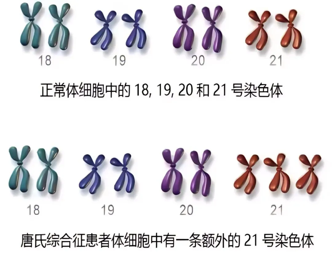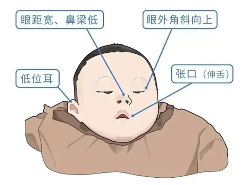 唐氏综合症(Downs syndrome)是世界上最早发现也是发病率最高的常染色体病。1959年,法国细胞遗传学家杰罗姆.勒基恩(Jerome LeJeune)发现唐氏综合症是由第21号染色体三体变异引起的。1961年《柳叶刀》杂志首先使用了“唐氏综合症”(Down syndrome),1965年世界卫生组织同意该命名。DS的发病机制是由于21号染色体的配子减数分裂异常造成的(约占95%比例)、同源罗伯逊易位型21-三体的发生机制可能为着丝粒有丝分裂错误或者姐妹/非姐妹染色单体之间形成U行交换约占4%、嵌合型21-三体约占1%(部分细胞正常,另一部分细胞核型为21-三体型,临床症状较轻)。唐氏综合症患儿除了典型面容,常合并有认知损害、学习和记忆能力降低、智力低下、先天性心脏病、早发的阿尔兹海默病以及白血病,肠道畸形等多系统损害。唐氏综合症患儿的表型在个体间存在差异,例如认知障碍是DS患者共有的表现,而只有40%的DS会出现先天性心脏病。这些差异可能和具体的基因型、个体的外显率、以及环境因素等有关。DS的典型外貌:眼距宽、外眼角上写(类似杏仁眼);鼻梁低平、耳位低;舌头肥大、常张口;手掌宽短、通贯掌。