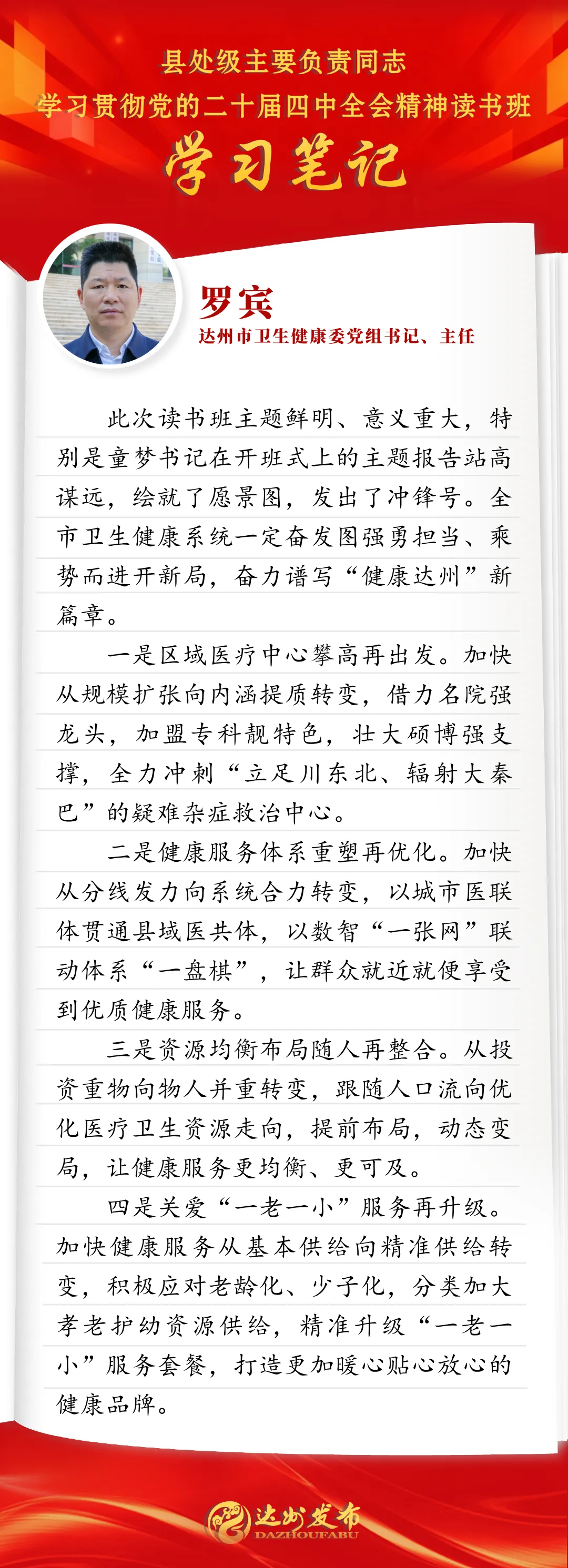 >读书班学习笔记 | 达州市卫生健康委党组书记、主任罗宾:聚焦四大任务 奋力谱写健康达州新篇章