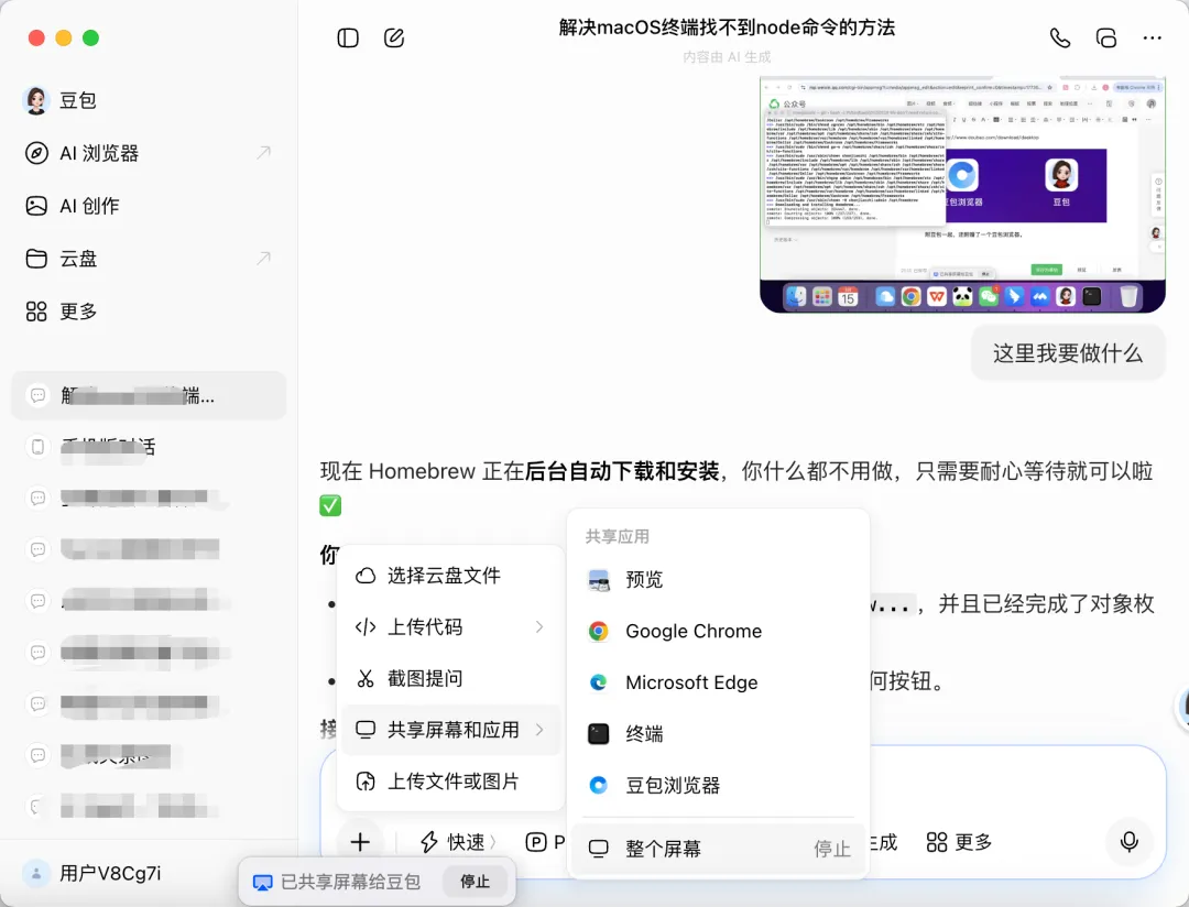 ”就可以了。豆包就会获取当前桌面界面,并指导我们操作。