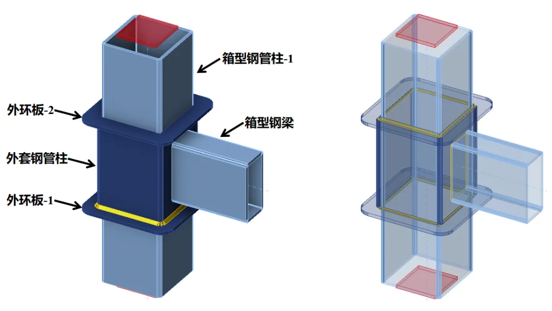 一个典型的梁柱节点,节点区钢管柱截面较小不便施加内加劲肋,采用外环板加劲。此节点的特点在于: