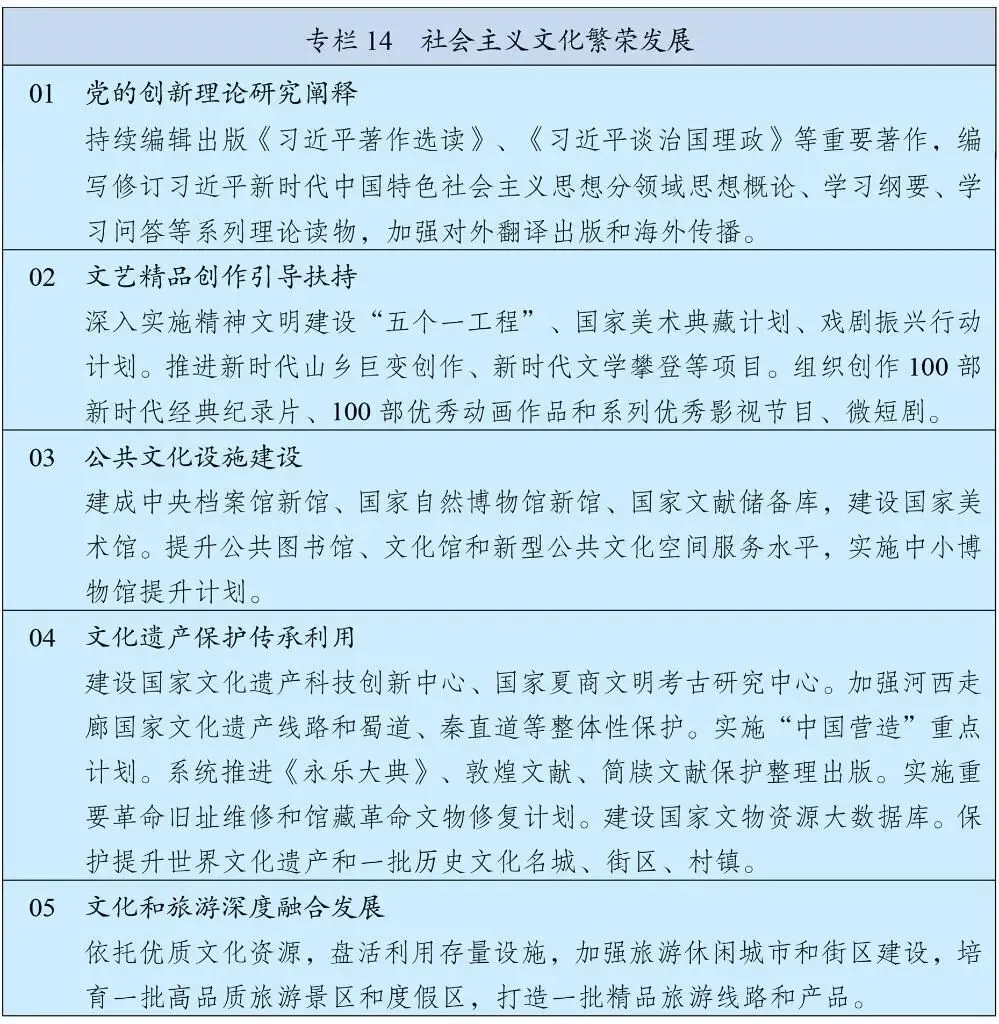 推动文化遗产系统性保护和统一监管,推进管理资源整合,建立文化遗产保护督察制度。深入实施中华优秀传统文化传承发展工程,构建中华文明标识体系。实施中华文明探源和考古中国工程。加大世界文化遗产、古迹遗址、革命文物、馆藏文物、文化景观等保护力度,加强历史文化名城、街区、村镇有效保护和活态传承。建好用好长城、大运河、长征、黄河、长江国家文化公园,优化建设管理体制机制。强化档案文献遗产保护和古籍抢救性保护,加强中华典籍文献传承。提升非物质文化遗产保护传承水平,培育传承体验新场景。加强和改进地方志工作。
