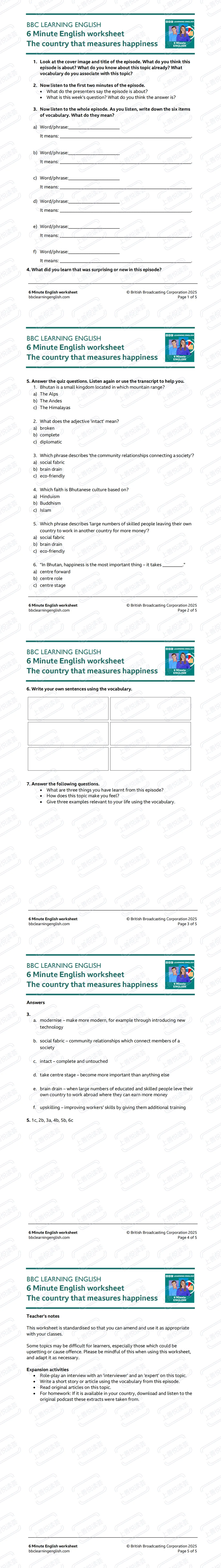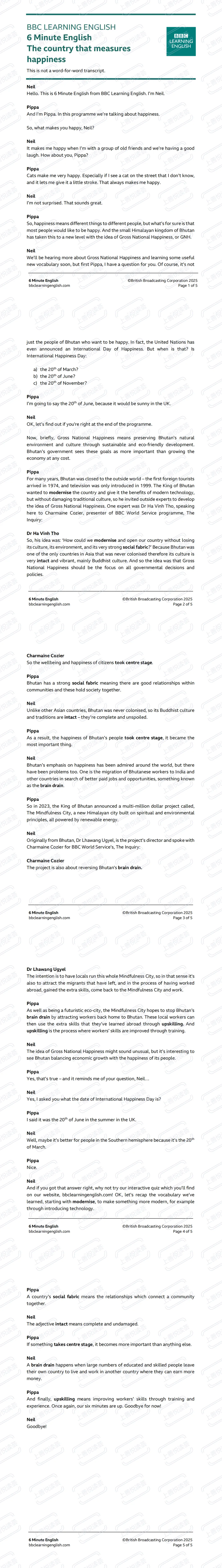 🎯 导语:你是否曾思考过,幸福能否被量化?在追求经济飞速增长的今天,有一个喜马拉雅山麓的小国却选择了一条与众不同的道路。它不以传统的国民生产总值(GDP)作为衡量国家发展的唯一标准,而是独树一帜地提出了“国民幸福总值”(Gross National Happiness, GNH)的概念。本期《BBC6分钟英语》将带你走进这个神秘的国度——不丹,探寻它如何在现代化浪潮中守护传统文化,以及它为平衡经济发展与国民福祉所做出的独特尝试。