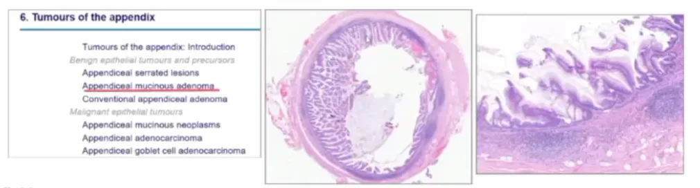 新增阑尾黏液腺瘤:黏膜内、黏膜肌完整,良性;