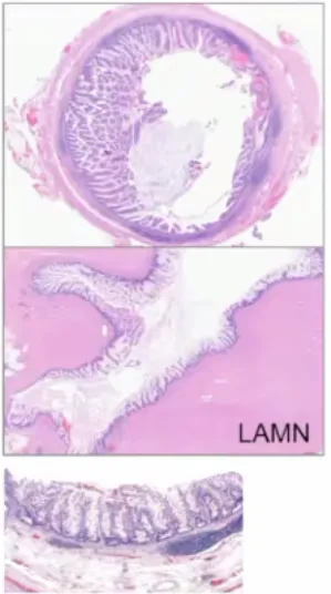 阑尾黏液腺瘤:肿瘤性黏液上皮细胞呈环形增生,局限于黏膜内且黏膜肌层完整,起源于阑尾;