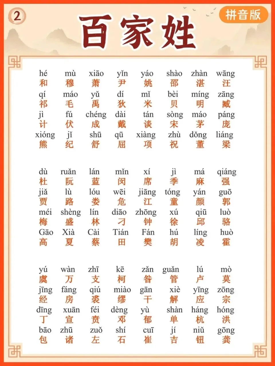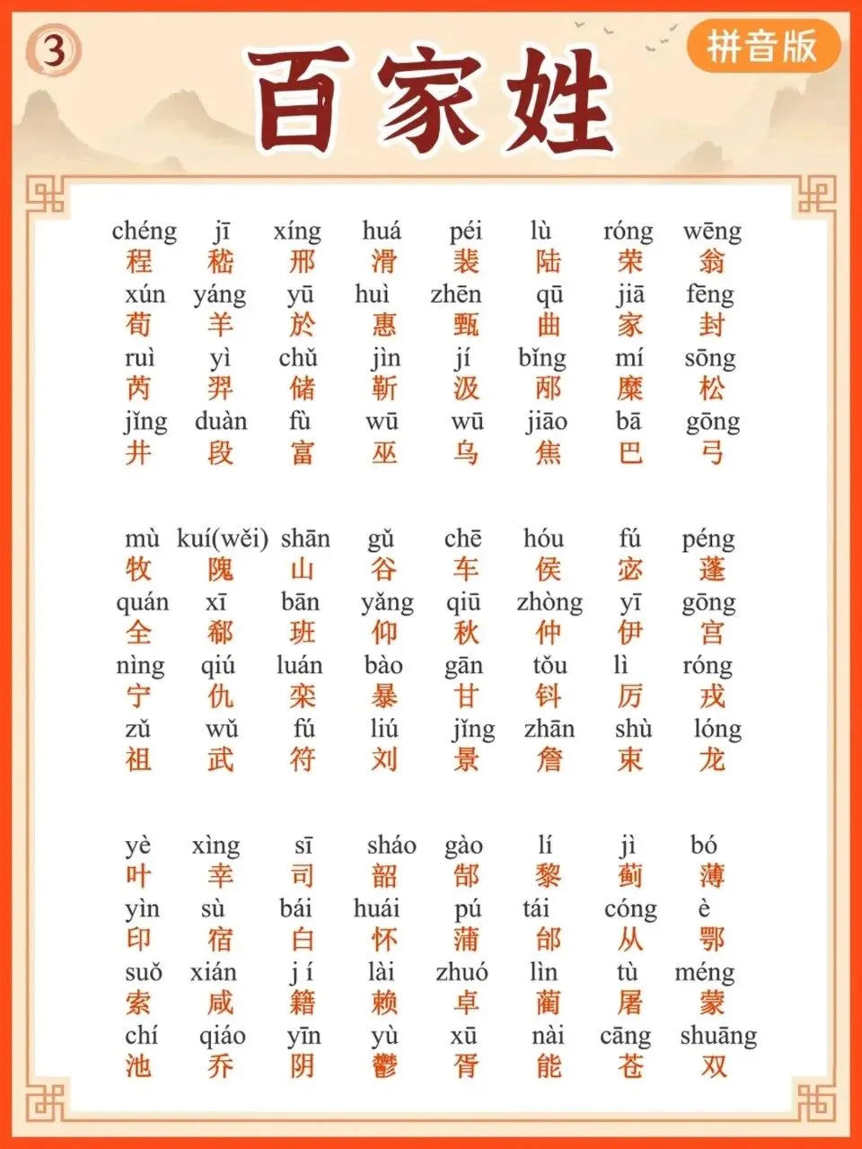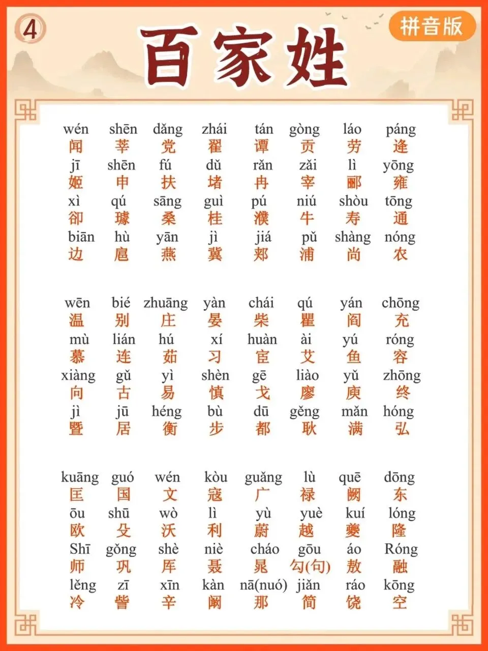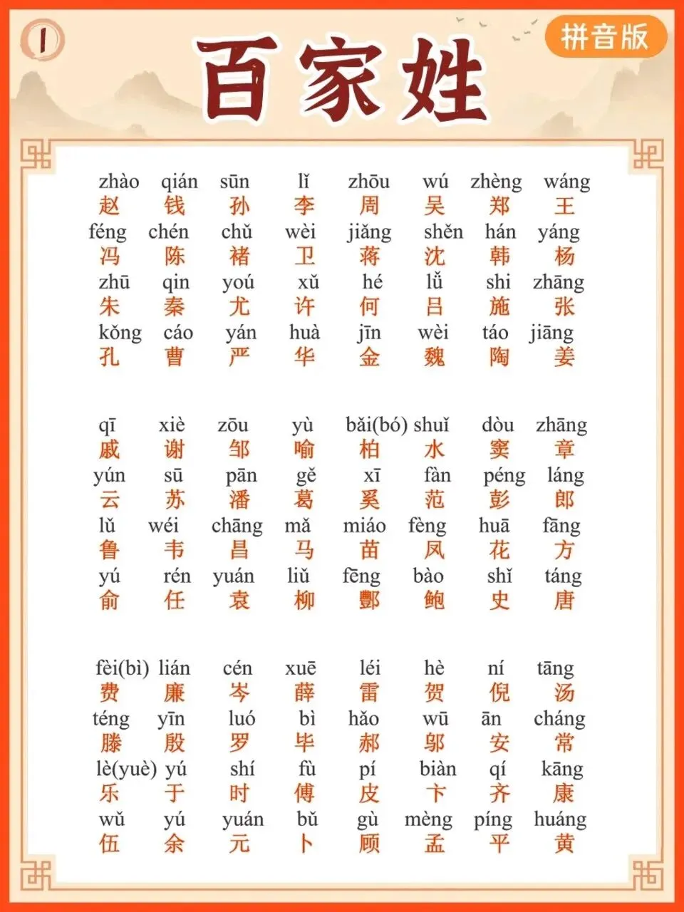 【小学通用】每日晨读-百家姓-有拼音(6页)