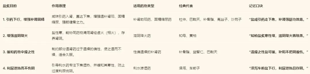 1.原理:盐炙法以“咸入肾”理论为核心,利用食盐的咸寒、下行、软坚、润燥之性,引导药力下行,直达下焦(肾、膀胱),从而增强补肾、固精、利尿、滋阴降火等与肾经相关的疗效。