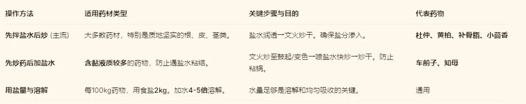 (1)主流方法:先拌盐水后炒(适用于大多数药材,如杜仲、黄柏)。