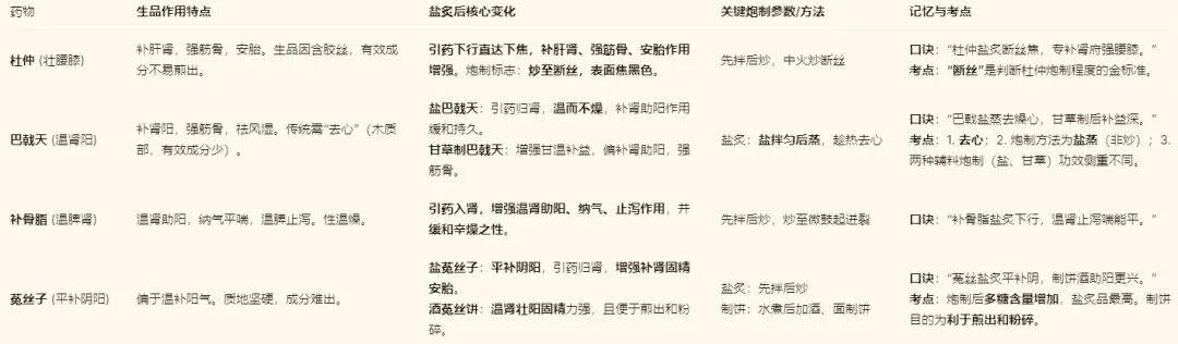 (1)对温阳药(杜仲、巴戟天),盐炙是 “增效+缓性”——增强补肾作用,同时缓和温燥之性,使之温润。