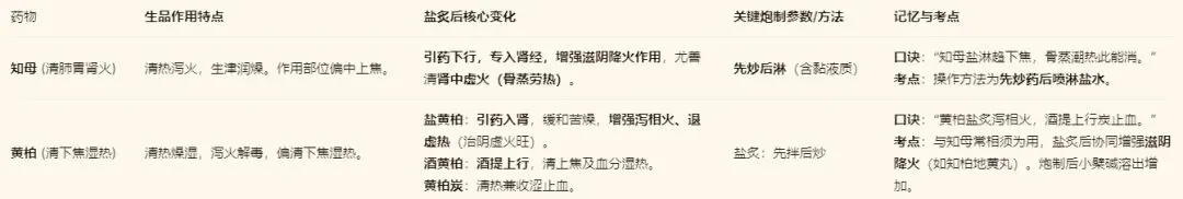 (1)横向对比:知母与黄柏,同为清热药,盐炙后均增强滋阴降火,常相须为用。