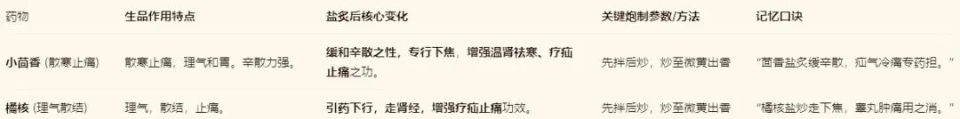 (2)小茴香:生用理气和胃(走中上)→ 盐炙疗疝止痛(走下焦)。