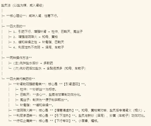 1.抓住“咸寒下行,直达下焦”的总纲:这是理解所有盐炙药物炮制意图的钥匙。无论补肾、泻火还是利尿,最终都服务于“肾”这个核心。