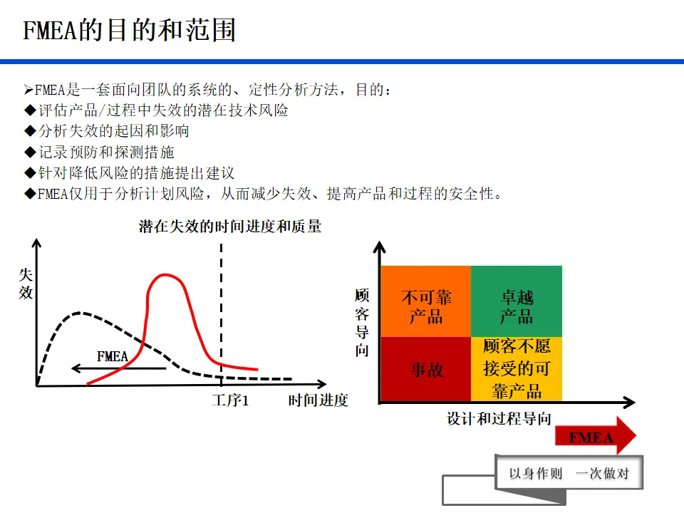 我们来看这张图——"潜在失效的时间进度和质量"关系图。横轴是时间进度,纵轴是失效的影响。在没有FMEA的情况下,我们往往在量产甚至交付后才发现问题,这时候的纠正成本极高,可能面临召回、事故、顾客不满。而有了FMEA,我们在设计阶段和过程策划阶段就识别潜在失效,将"不可靠产品"转变为"卓越产品",将"事故"转变为"顾客可接受的可靠产品"。这就是FMEA的价值——