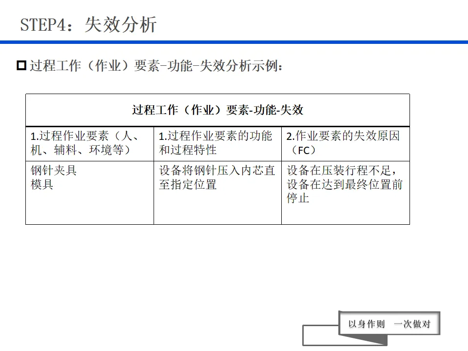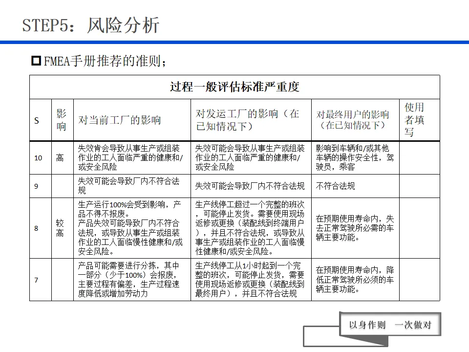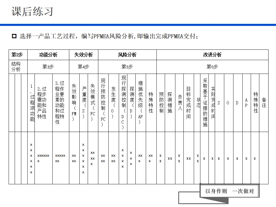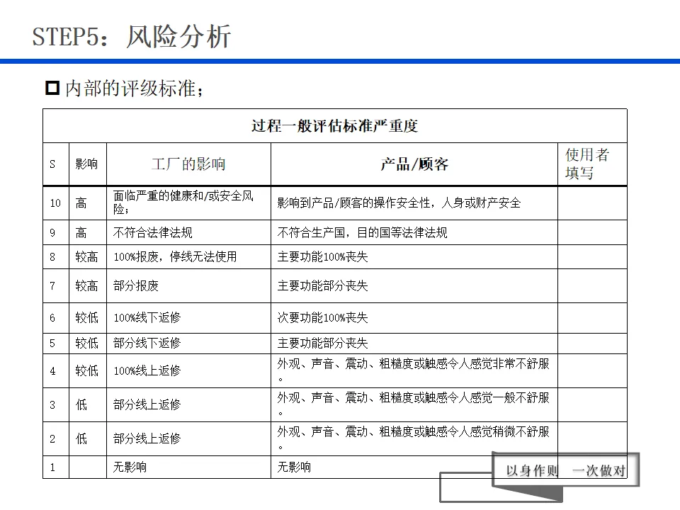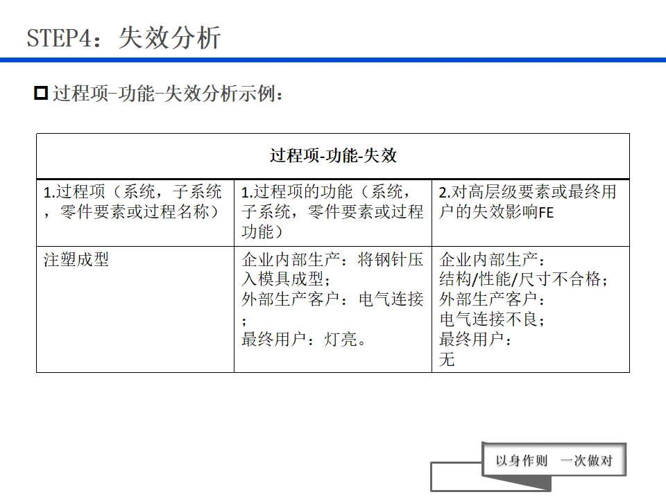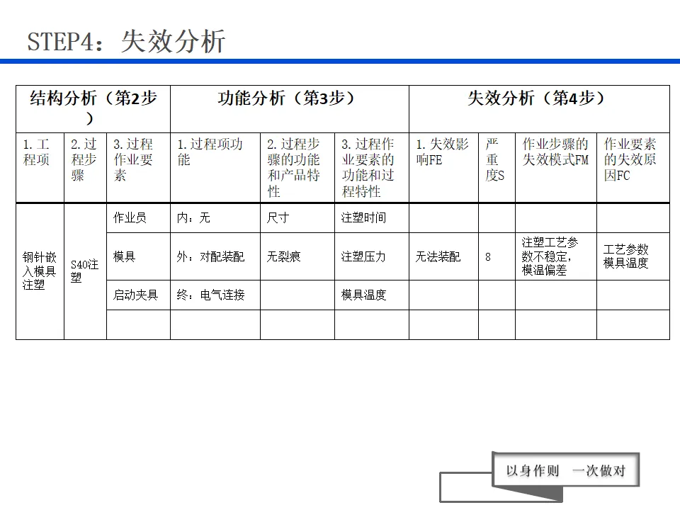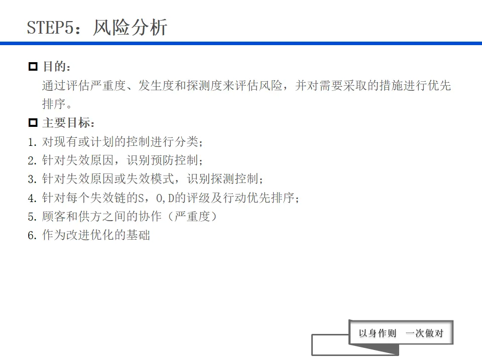 :根据过程步骤进行风险分析。PFMEA关注制造过程是否能够保证设计要求得以实现。它分析的对象是过程步骤、工位、作业要素。