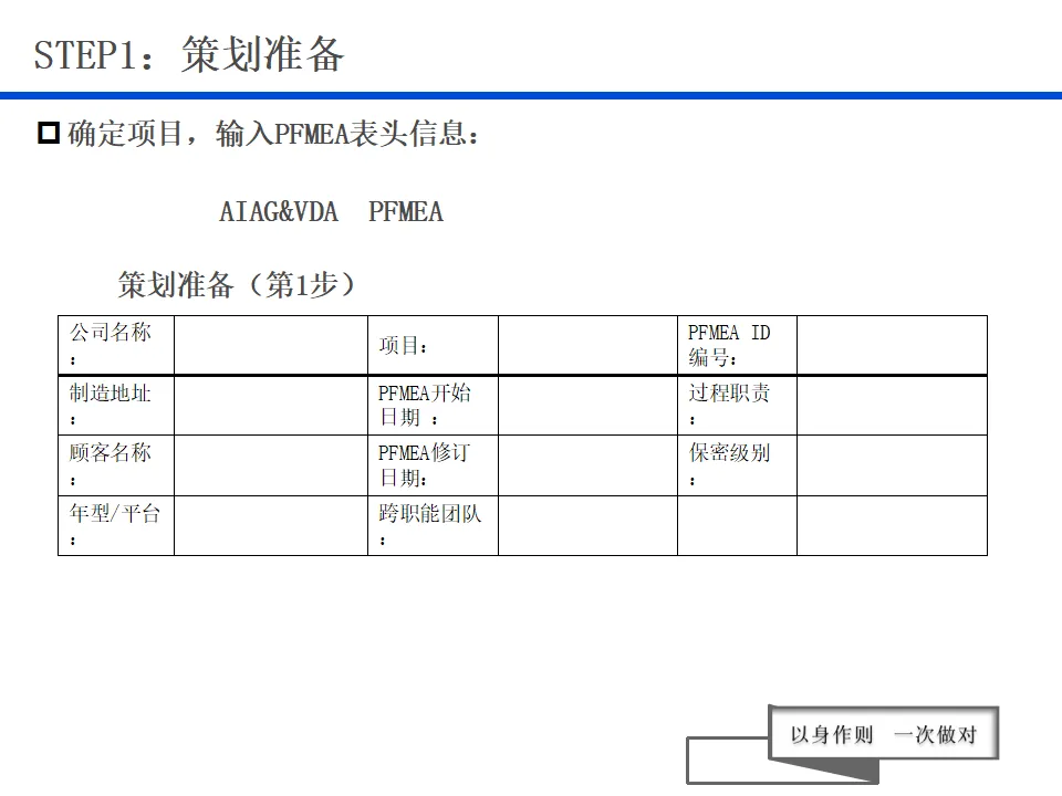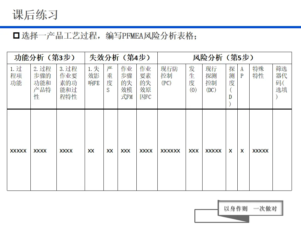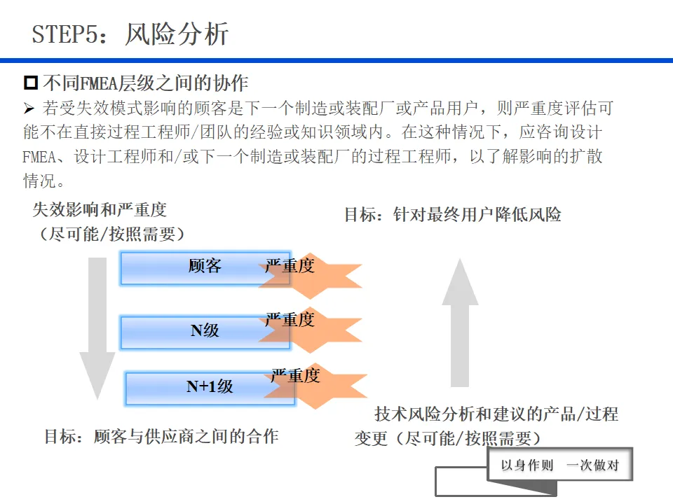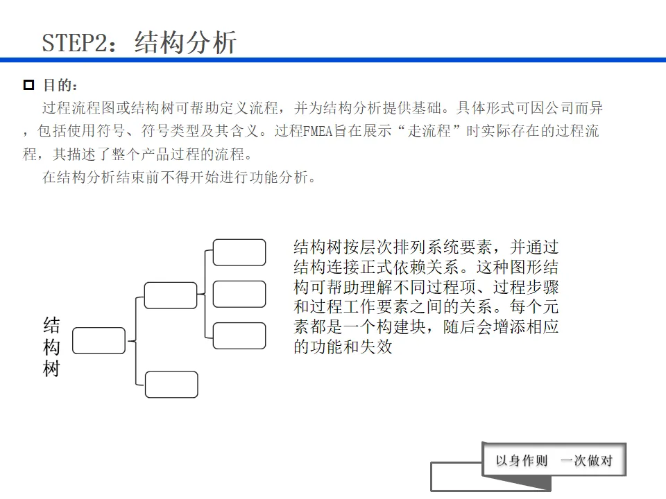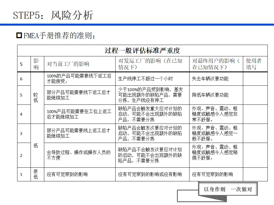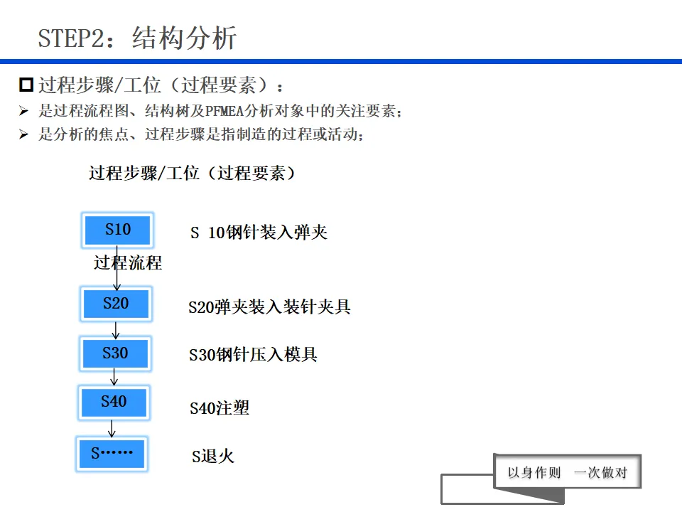 :根据过程步骤进行风险分析。PFMEA关注制造过程是否能够保证设计要求得以实现。它分析的对象是过程步骤、工位、作业要素。